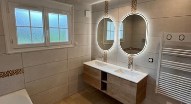 Confiez-nous la réalisation de votre salle de bain de A à Z : plomberie, installation des sanitaires, carrelage et faïence. Un espace fonctionnel et esthétique, conçu dans les moindres détails.